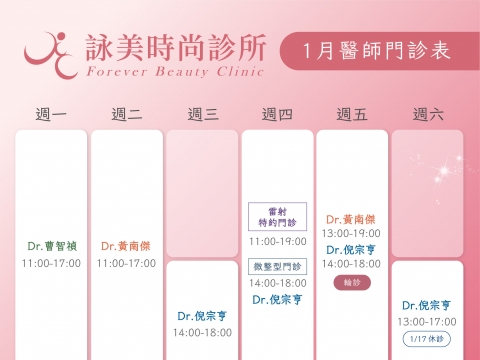 《最新公告》 為提供更優良的服務品質,詠美時尚診所將更動營業時間~ 診所〝營業時間〞將調整為: 平日(週一至週五):上午10:00~下午19:00 假日(週六):上午10:00~下午18:00 <週日公休> 造成不便,敬請見諒! 如有相...